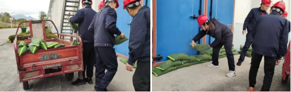 救援組一部分人員利用防汛沙袋,對(duì)倉房大門進(jìn)行阻擋防護(hù),以最快速度攔截積水,防止積水進(jìn)入倉內(nèi),同時(shí)安排人員排查庫區(qū)各下水道口,確保排水系統(tǒng)正常運(yùn)轉(zhuǎn)。