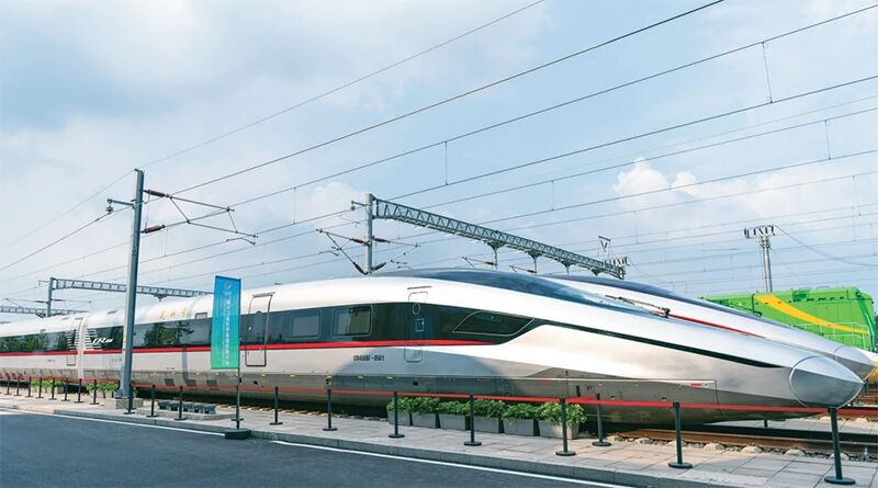 “十四五”時(shí)期,以CR450動(dòng)車(chē)組為代表的一項(xiàng)項(xiàng)重大技術(shù)裝備項(xiàng)目取得新進(jìn)展、實(shí)現(xiàn)新突破。CR450動(dòng)車(chē)組試驗(yàn)速度可達(dá)450公里/小時(shí),運(yùn)營(yíng)速度可達(dá)400公里/小時(shí),是全球跑得最快的高鐵。圖為2025年7月9日,在國(guó)家鐵道試驗(yàn)中心展區(qū)拍攝的CR450BF動(dòng)車(chē)組。 新華社記者 才揚(yáng)/攝