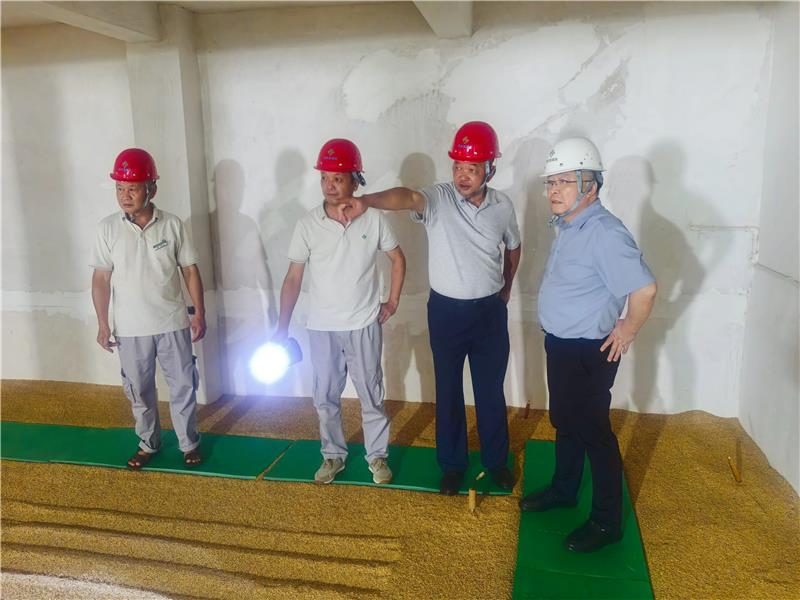 在梧梓庫區,他聽取了庫負責人關于防臺防汛、糧食儲存工作情況的匯報,并進入7號倉厫仔細查看糧情,詳細了解臺風暴雨天氣對舊倉房儲糧的影響等情況。他強調,當前正值主汛期,近期受“范斯高”“竹節草”雙臺風疊加影響,即將來臨的大風、強降雨天氣對省級儲備糧安全保管又是一個較大考驗。全庫干部職工務必要引起高度重視,牢固樹立安全防范意識,加強重點部位巡查和排險,備齊備足防汛物資,落實24小時領導帶班和值班制度;值班人員要保持通訊暢通,嚴陣以待,在關鍵時刻能及時有效應對,確保人安、庫安、糧安。